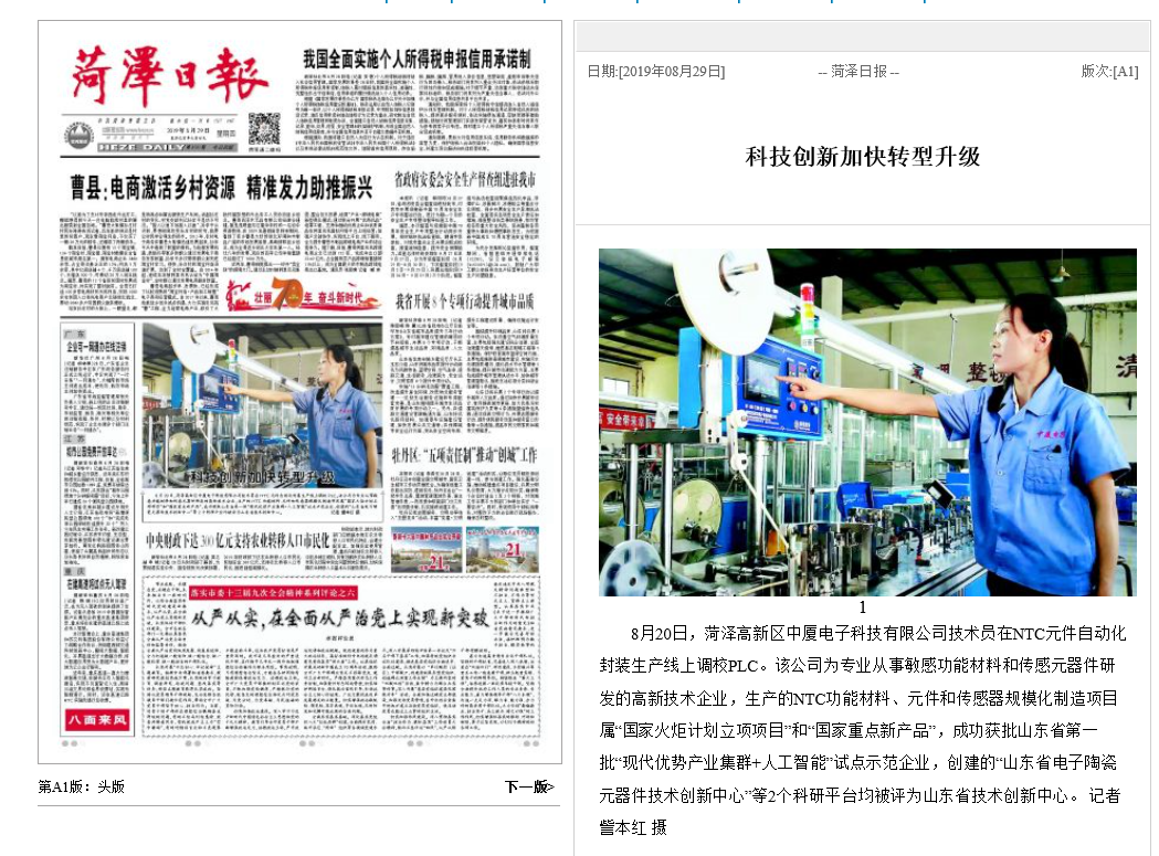 2019年8月29日《菏澤日報》報道:“科技創新加快轉型升級”。中廈電子科技有限...